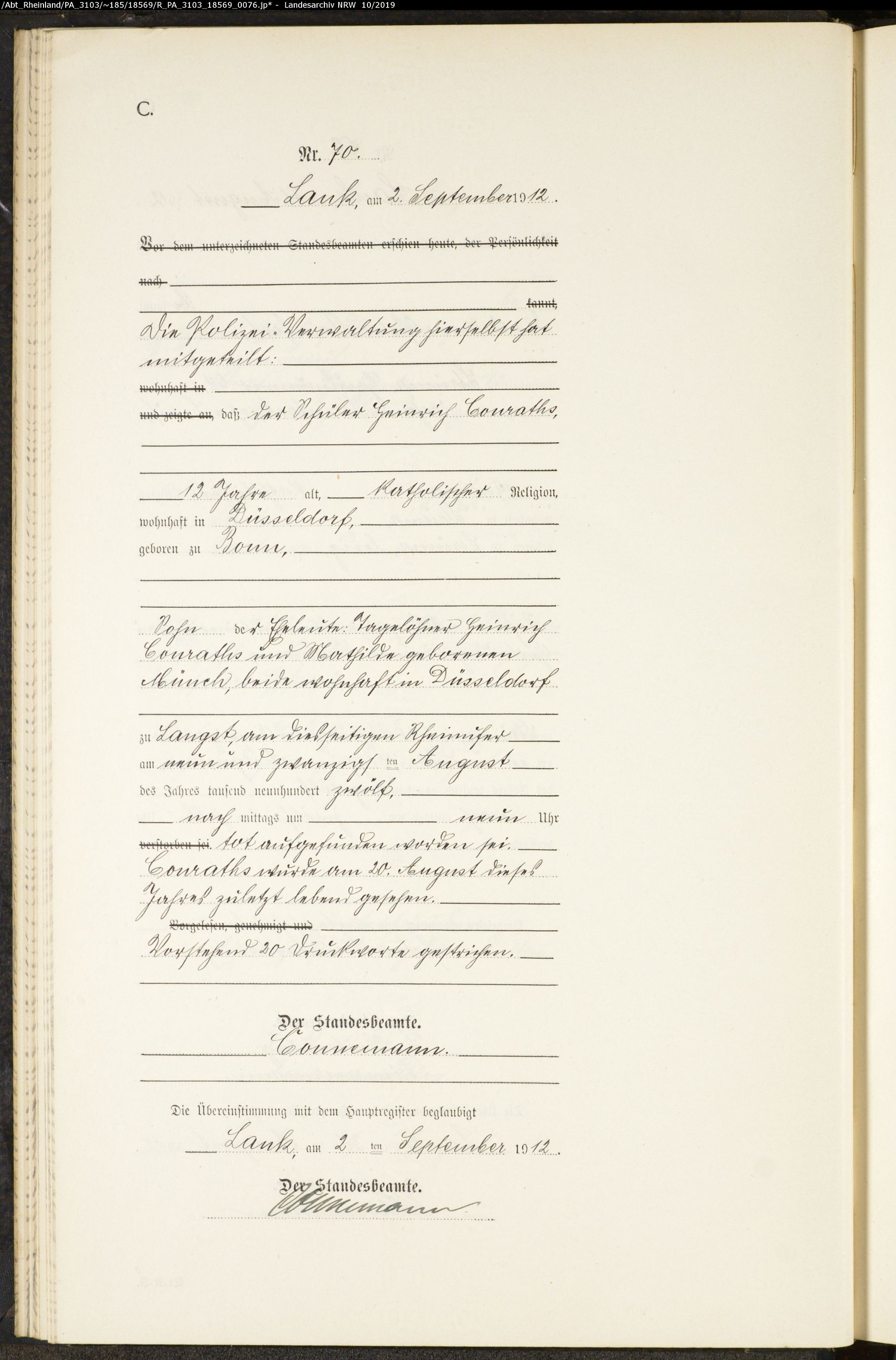 - Conraths, Heinrich, Schüler, geb. zu Bonn, ca. 1900, tot aufgefunden am 29. August 1912 zu Langst (heute Meerbusch) am diesseitigen Rheinufer, wurde zuletzt am 20. August lebend gesehen, Alter 12 Jahre, zuletzt wohnhaft in Düsseldorf, katholischer Religion, Sohn der Eheleute Taglöhner Heinrich Conraths und Mathilda geborene Münch, beide wohnhaft in Düsseldorf Sterberegister 70/1912 Standesamt Lank