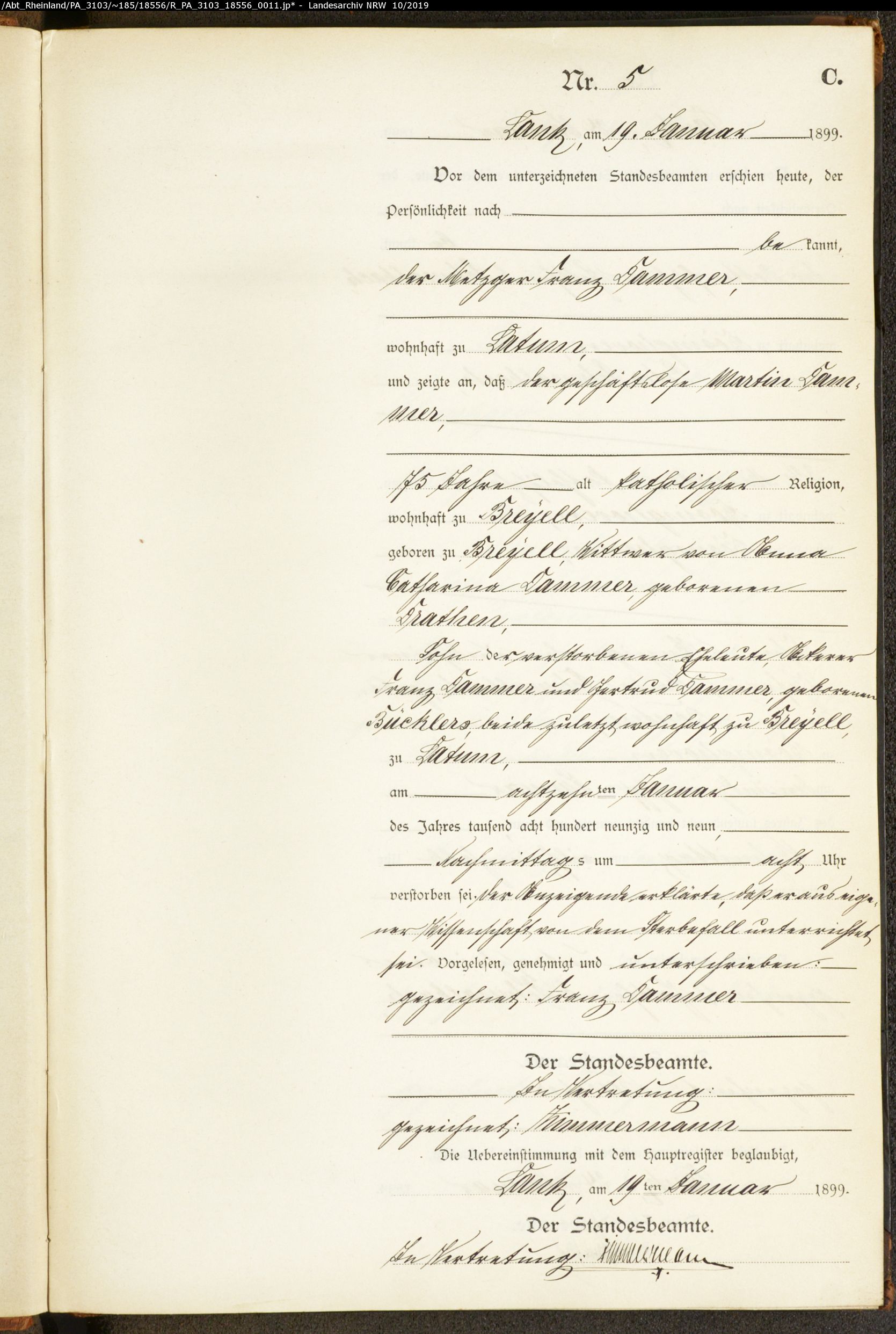 - Dammer, Martin, geb. in Breyell ca. 1824, wohnhaft zu Breyell, verst. 18.Januar 1899 in Latum (heute Meerbusch), Alter 75 Jahre, verwittwert von Drathen, Anna Catharina, Sohn von Ackerer Dammer, Franz und Bucklers, Gertrud, beide verstorben zu Breyell, Anzeigender Metzger Dammer, Franz, wohnhaft zu Latum Sterberegister 5/1899 Standesamt Lank