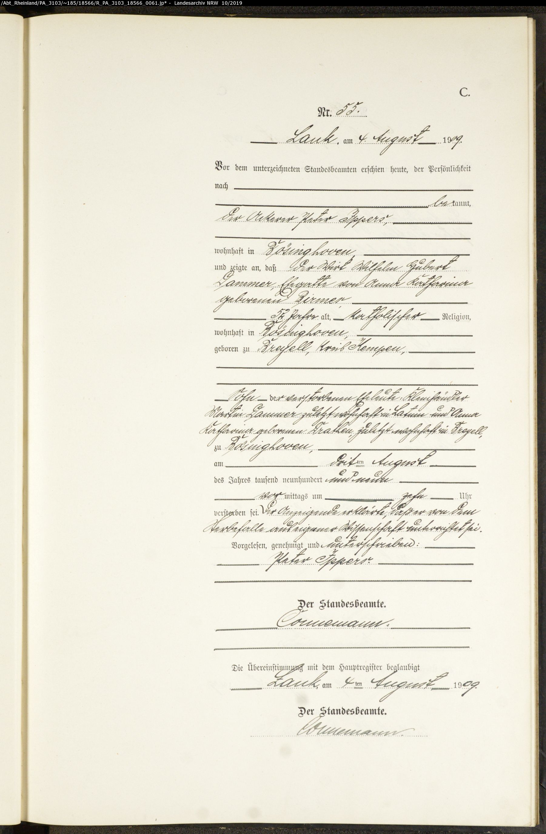 - Dammer, Wilhelm Hubert, Wirt, geb. in Breyell ca. 1857, wohnhaft zu Bösinhoven, verst. 03.August 1909 in Bösinghoven (heute Meerbusch), Alter 52 Jahre, ktholischer Religion, Ehegatte von Birmer, Anna Katharina, Sohn der verstorbenen Eheleute Kleinhändler Martin Dammer zuletzt wohnhaft in Latum und Anna Katharina Drathen zuletzt wohnhaft in Breyell, Anzeigender Ackerer Peter Ippers, wohnhaft zu Bösinghoven Sterberegister 55/1909 Standesamt Lank