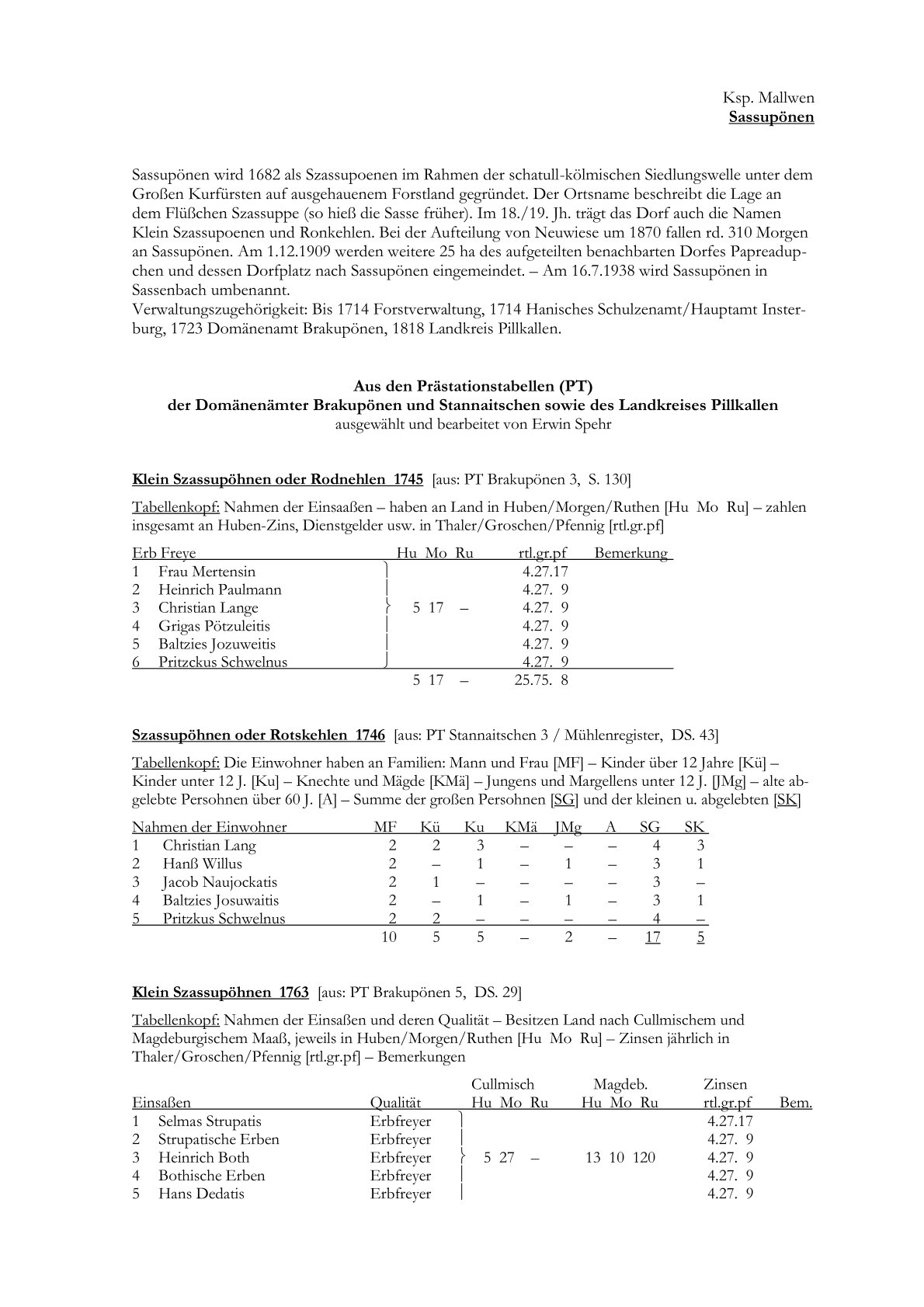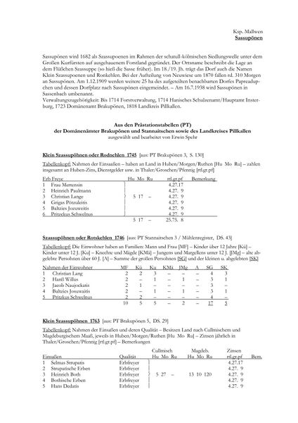 Sassupönen / Sassenbach aus den Prästationstabellen (PT) der Domänenämter Brakupönen und Stannaitschen sowie des Landkreises Pillkallen | ||