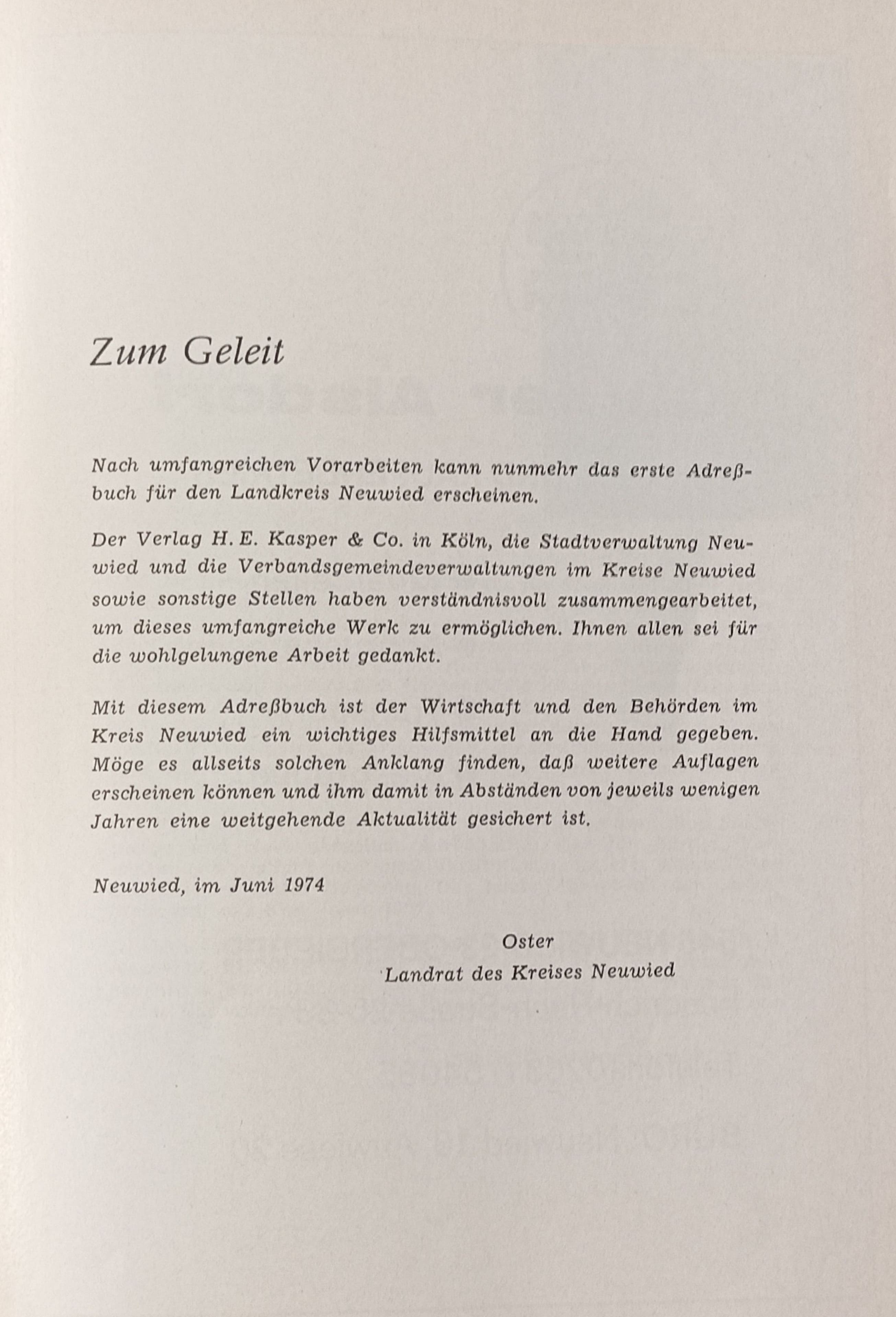 Kasper's Einwohner-Adreßbuch Landkreis Neuwied 1974, Geleitwort |