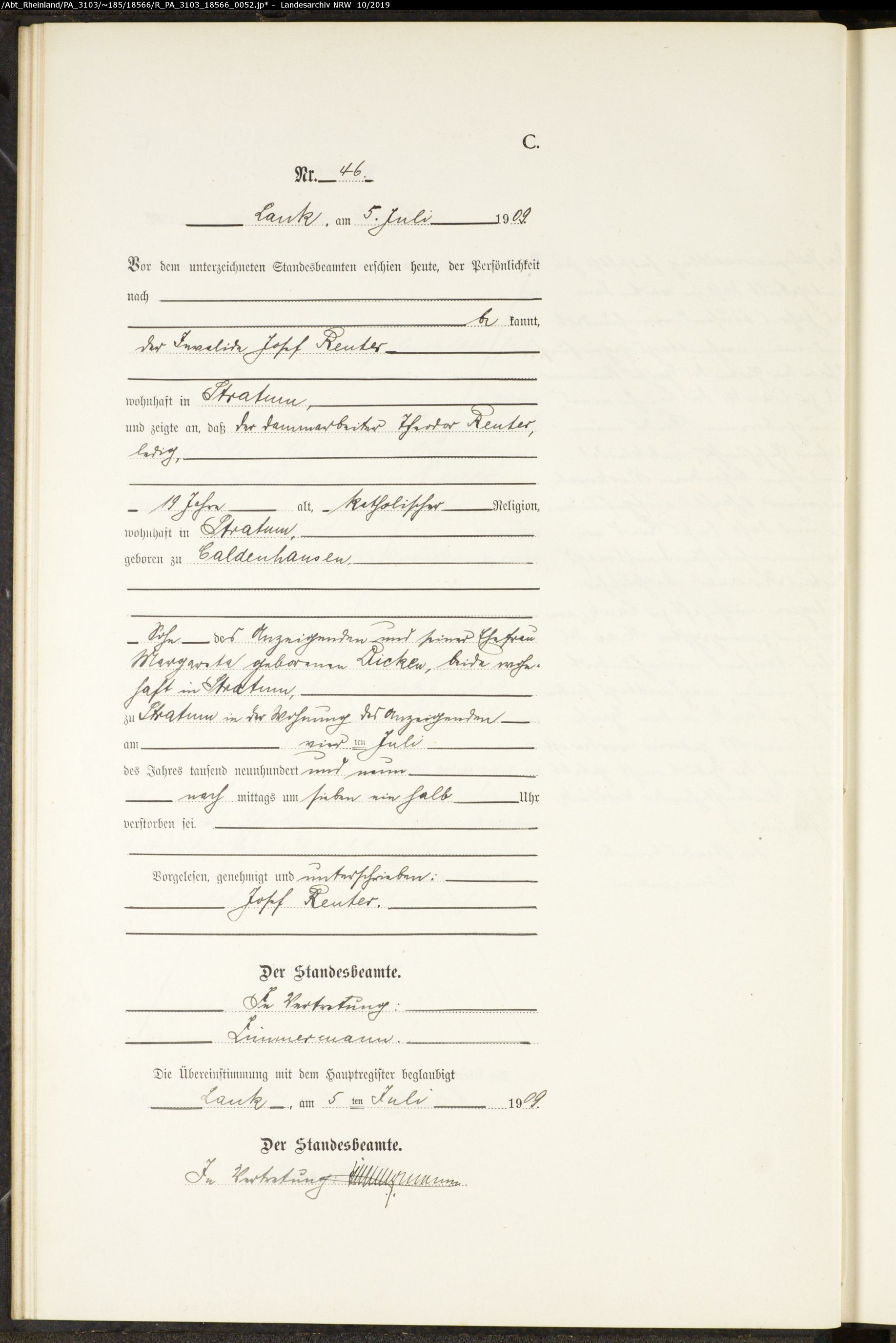 - Reuter, Theodor, Dammarbeiter, geb. ca. 1890 in Caldenhausen, verst. 04.Juli 1909 in Stratum (heute Krefeld) zu der Zeit Bürgermaeisterei Lank (heute Meerbusch), Alter 19 Jahre, katholischer Religion, ledig, wohnhaft zu Stratum, Sohn von Invalide Josef Reuter, Anzeigender, und Margareta Dicken, Sterberegister 46/1909 Standesamt Lank