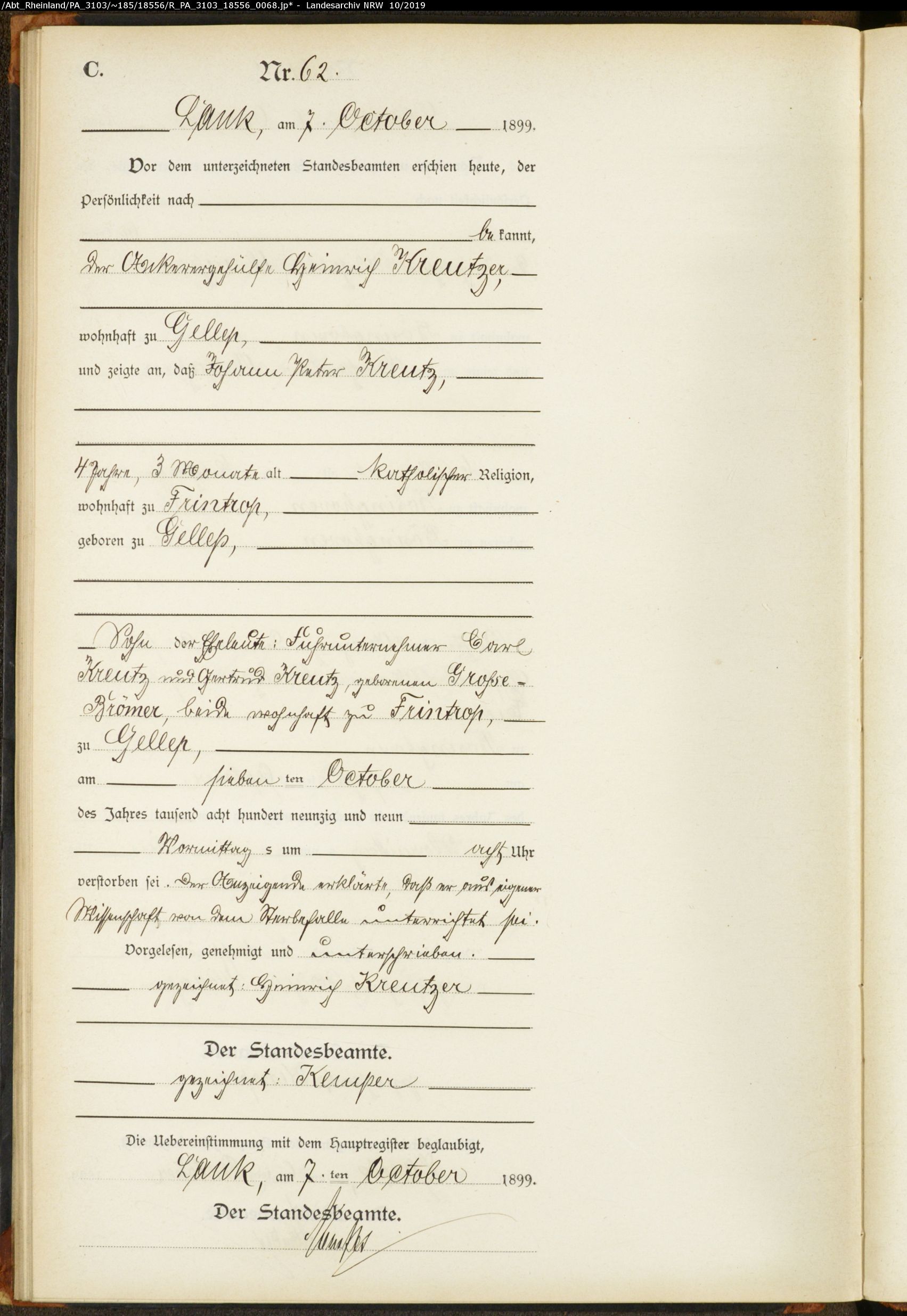 - Johann Peter Kreutz, geb. ca. 1895 in Gellep jetzt Krefeld, verst. am 07.Oktober 1899 zu Gellep, Alter 4 Jahre 3 Monate, wohnhaft zu Frintrop, Sohn von Fuhrunternehmer Carl Kreutz und Gertrud Grosse-Brömer, beide wohnhaft zu Frintrop, Sterberegister 62/1899 Standesamt Lank