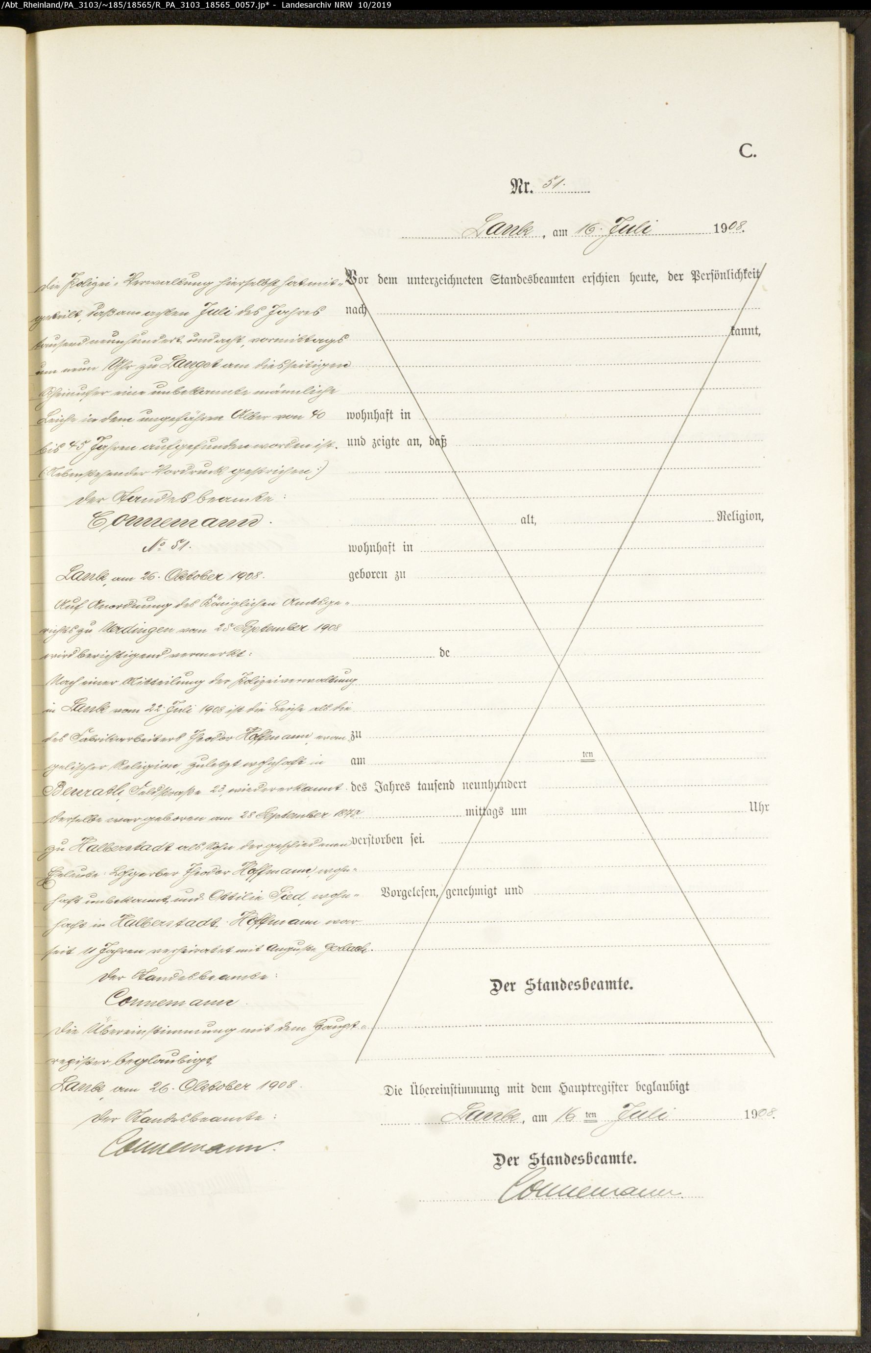 - Hoffmann, Theodor, Fabrikarbeiter, geb. in Halberstadt, am 28.September 1875, wohnhaft in Benrath Feldstr. 23, gefunden am diesseitigen Rheinufer zu Langst(heute Meerbusch) am 08.Juli 1908, evangelischer Religion, seit 11 Jahren Ehegatte von Auguste Gerlach, Sohn der geschiedenen Eltern Lohgerber Theodor Hoffmann unbekannter Wohnort und Ottilie geborene Sied wohnhaft in Halberstadt Sterberegister 51/1908 Standesamt Lank