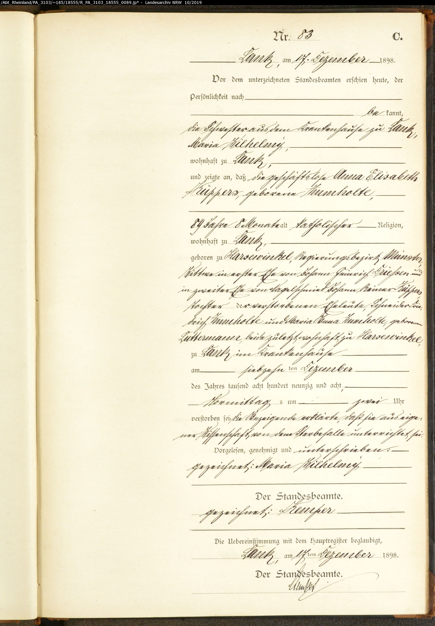 - Zumholte, Anna Elisabeth, geboren ca. April 1809 in Harsewinkel Regierungsbezirk Münster, verst. 17.Dezember 1898 in Lank (heute Meerbusch), im dortigen Krankenhaus, Wittwe in erste Ehe von Driessen, Johann Heinrich, und in zweiter Ehe von Küppers, Johann Rainer, Tochter von Schneider Zumholte, Friedrich, und Luttermann, Maria Anna, beide verstorben in Harsewinkel Sterberegister 83/1898 Standesamt Lank