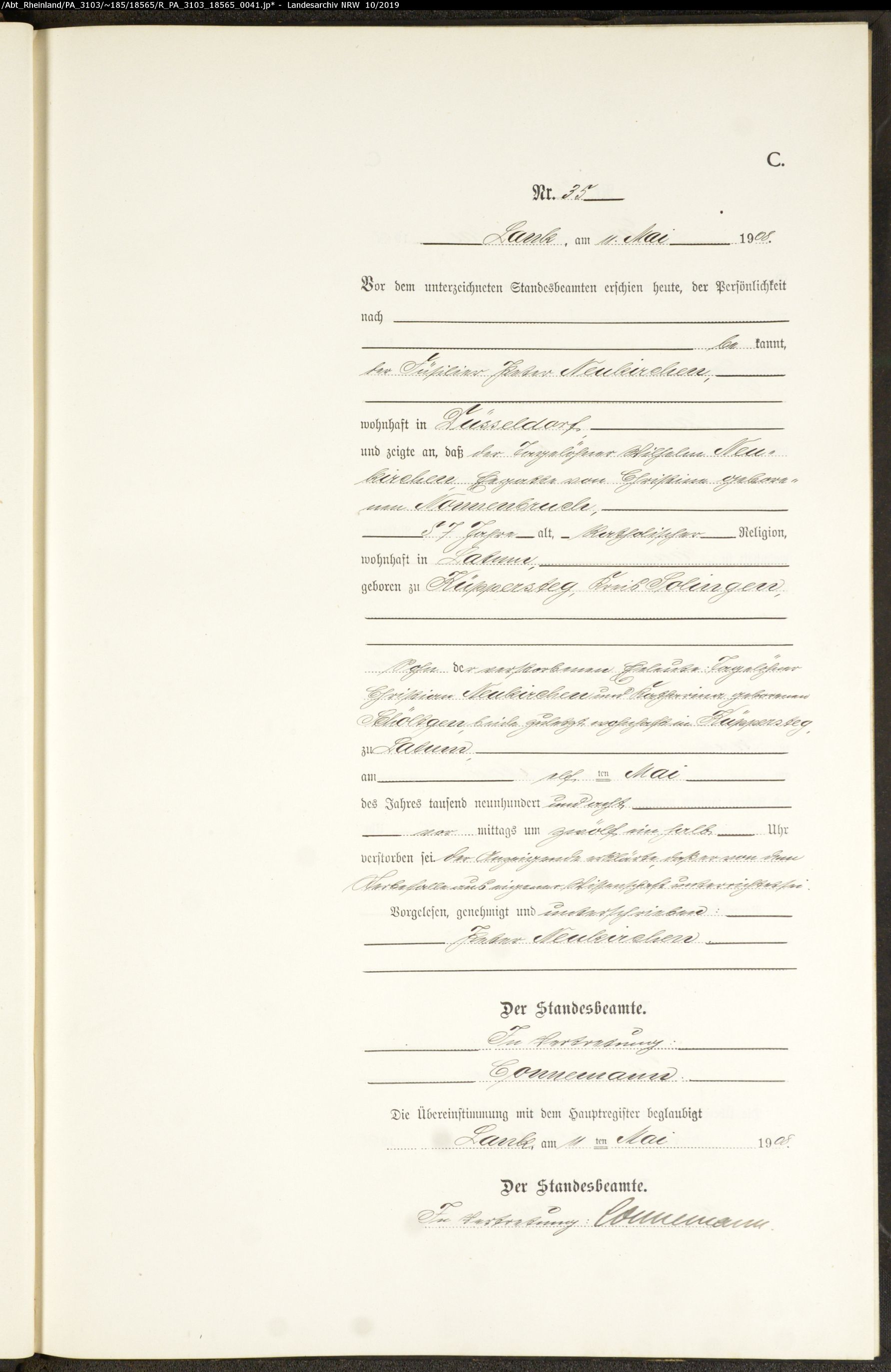 - Neukirchen, Wilhelm, geb. in Küppersteg Kreis Solingen, ca. 1851, verst. 11. Mai 1908 zu Latum (heute Meerbusch), Alter 57, Taglöhner, Ehegatte von Christina Nonnenbruch, Eltern Taglöhner Christian Neukirchen und Katharina geborene Schöltgen, beide zuletzt Wohnhaft in Küppersteg, Anzeigender Füsilier Peter Neukirchen , wohnhaft in Düsseldorf Sterberegister 35/1908 Standesamt Lank