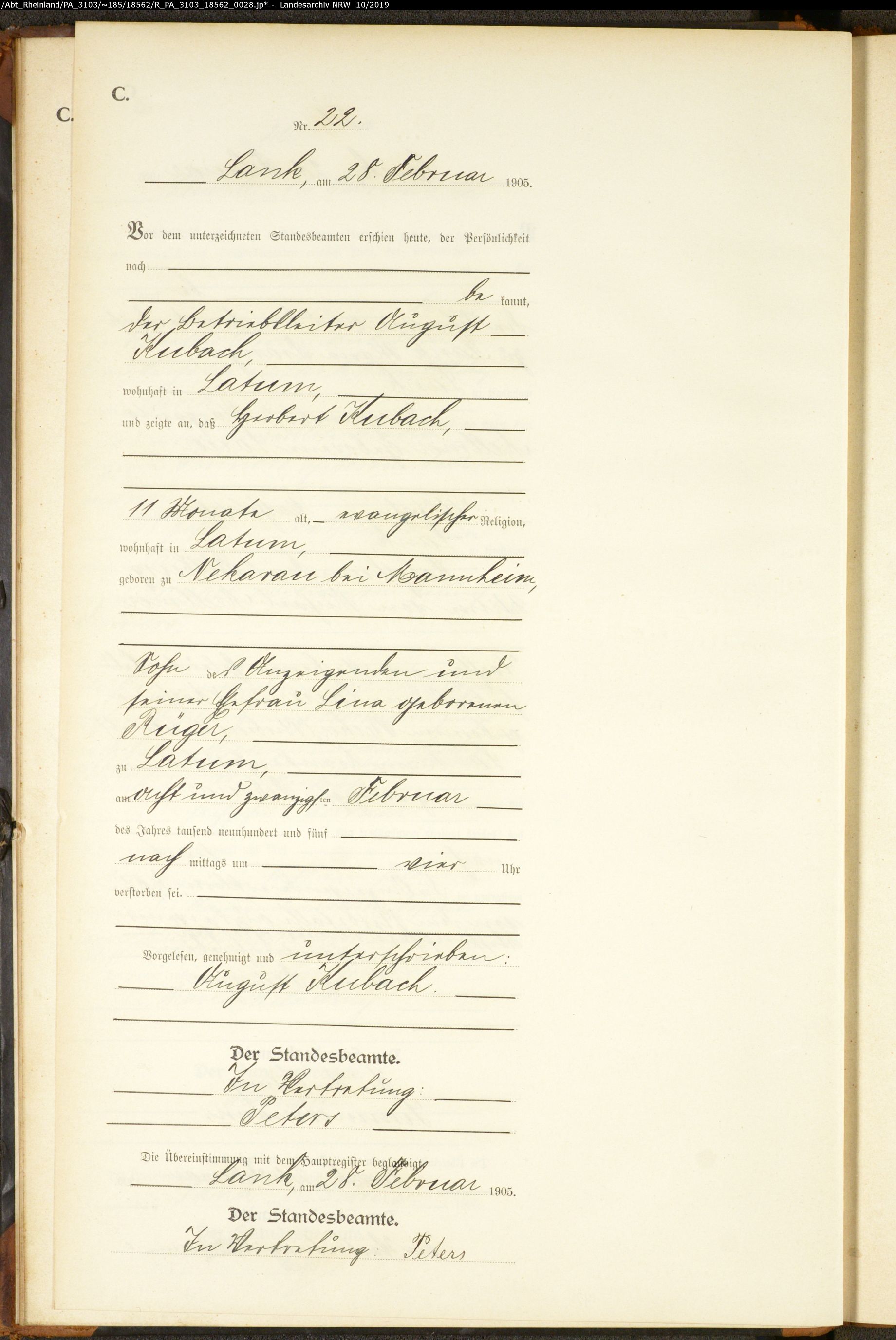 - Herbert Kubach, geb. zu Nekarau bei Mannheim, ca. 1904, Alter 11 Monate, verst. 28. Februar 1905 zu Latum (heute Meerbusch), Alter 11 Monate, Sohn von Betriebsleiter August Kubach, wohnhaft in Latum, und Lina Rüger Sterberegister 22/1905 Standesamt Lank