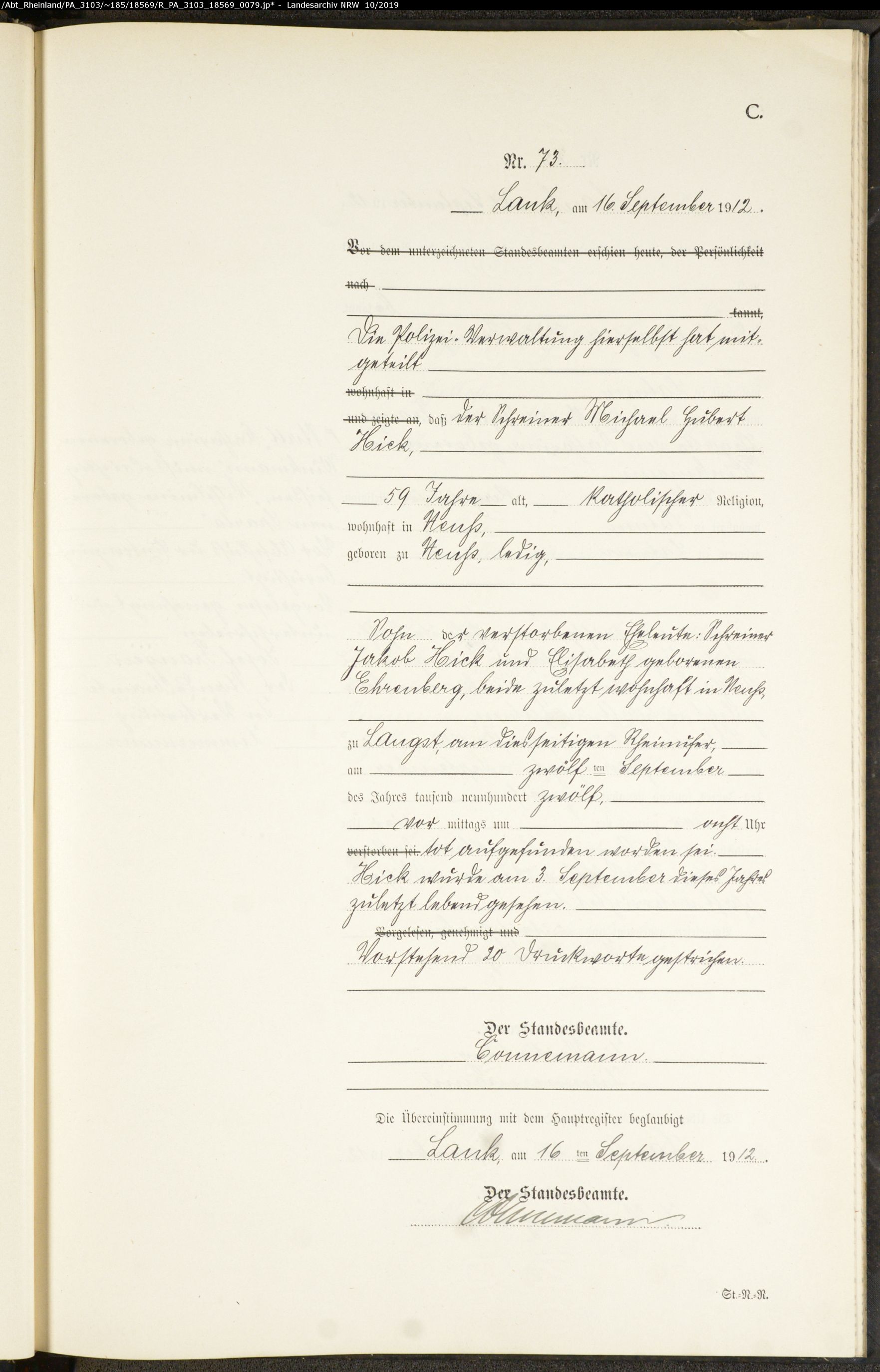 - Hick, Michael Hubert, Schreiner, geb. zu Neuss, ca. 1853, tot aufgefunden am 12. September 1912 zu Langst (heute Meerbusch) am diesseitigen Rheinufer, wurde zuletzt am 03. September lebend gesehen, Alter 59 Jahre, wohnhaft in Neuss, katholischer Religion, ledig, Sohn der verstorbenen Eheleute Schreiner Jakob Hick und Elisabeth geborene Ehrenberg, beide zuletzt wohnhaft in Neuss Sterberegister 73/1912 Standesamt Lank