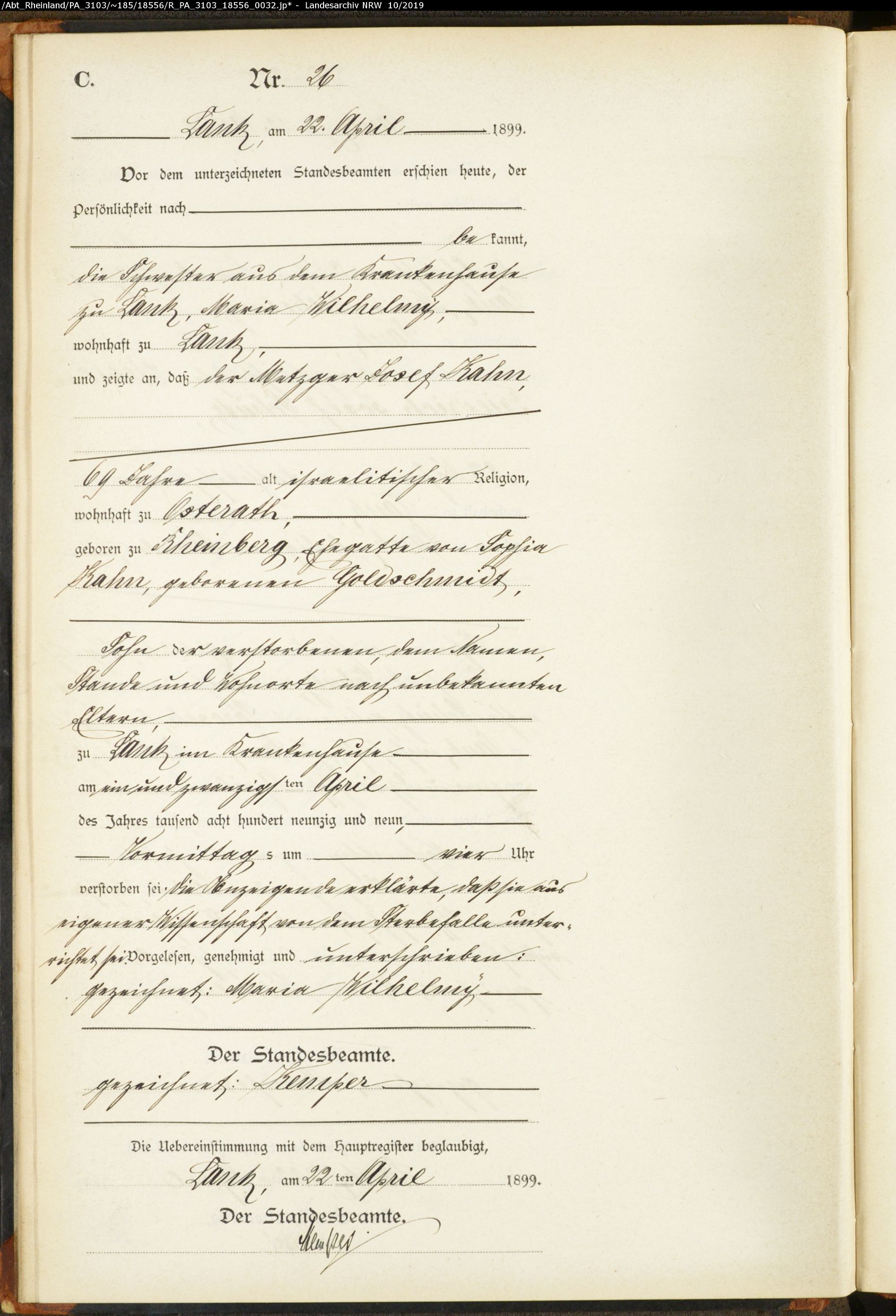 - Metzger Josef Kahn geb. zu Rheinberg, Wohnhaft zu Osterath, verst. Lank (heute Meerbusch) im Krankenhause, am 21.April 1899, Alter 69 Jahre, israelitischer Religion, Ehegatte von Sophia Goldschmidt Sterberegister 26/1899 Standesamt Lank