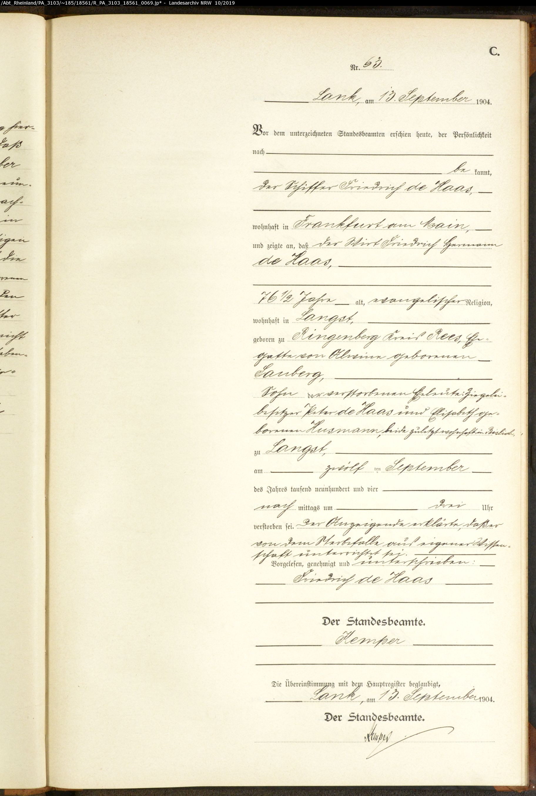 - Friedrich Hermann de Haas, Wirt, geb. in Ringenberg, Kreis Rees, geboren ca. 03/1828, verst. 12. September 1904 zu Langst (heute Meerbusch), Alter 76 1/2 Jahre, Ehegatte von Alwine Sauberg, Sohn von Ziegeleibesitzer de Haas, Peter, und Husmann, Elisabeth, beide zuletzt wohnhaft in Bislich, Zeuge Friedrich de Haas, Schiffer, wohnhaft in Frankfurt am Main Sterberegister 63/1904 Standesamt Lank