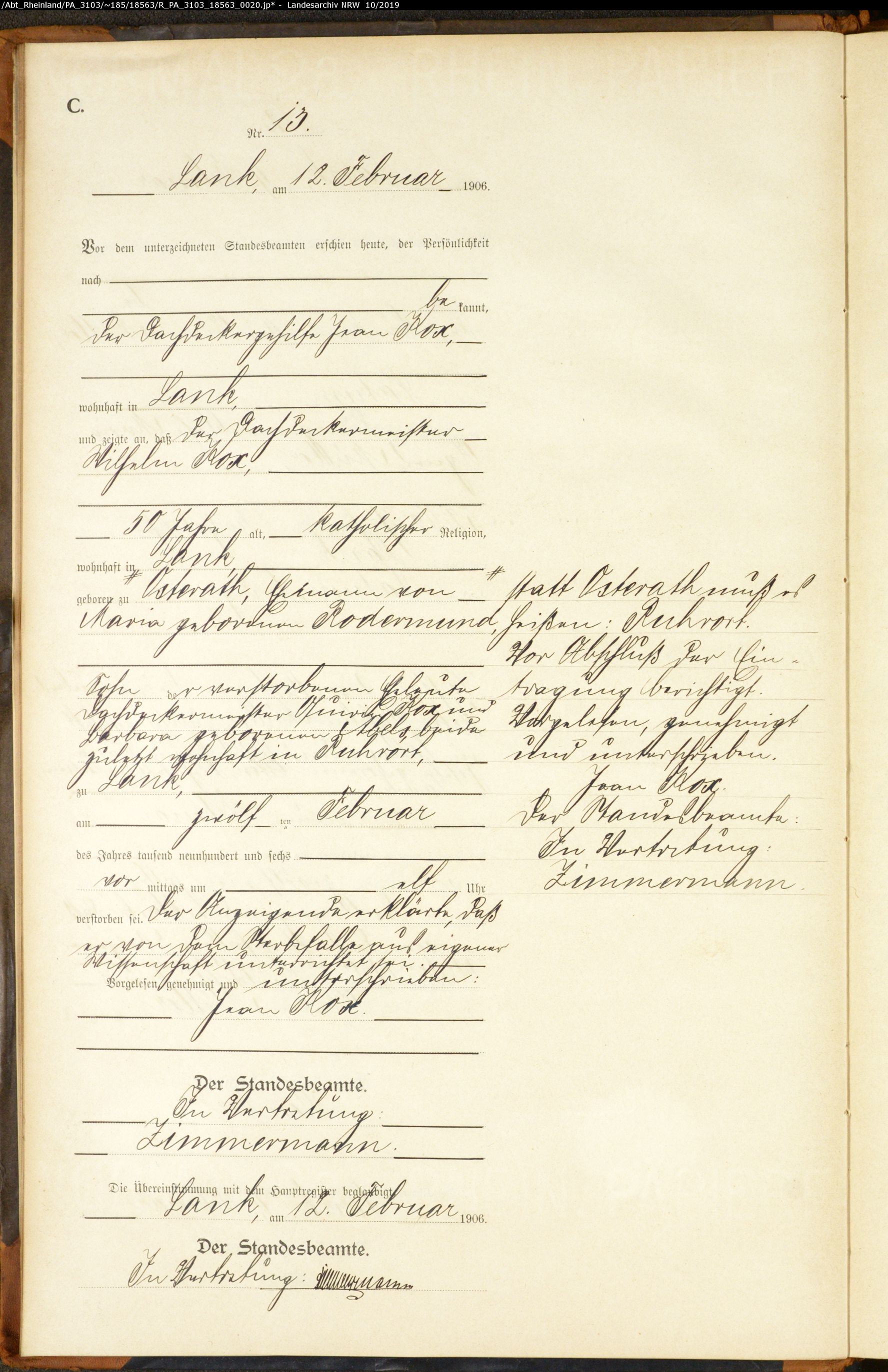 - Kox, Wilhelm, Dachdeckermeister, geb. in Ruhrort, ca. 1856, verst. 12. Februar 1906 zu Lank (heute Meerbusch), Alter 50 Jahre, Ehemann von Maria Rodermund, Eltern Dachdeckermeister Quirin Kox und Barbara geborene Abels, beide zuletzt Wohnhaft in Ruhrort, Anzeigender Kox, Jean, Dachdeckergehilfe, wohnhaft in Lank Sterberegister 13/1906 Standesamt Lank