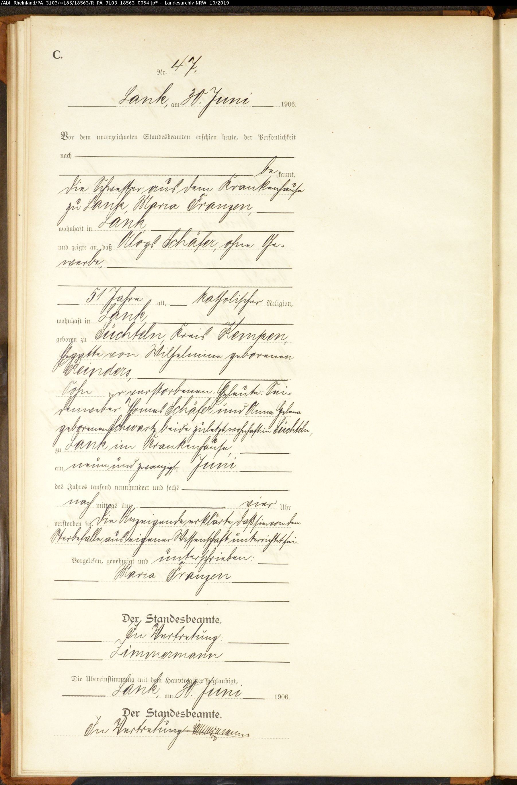 - Schäfer, Aloys, geb. in Süchteln Kreis Kempen, ca. 1854, verst. 29. Juni 1906 zu Lank (heute Meerbusch) im Krankenhause, Alter 51 Jahre, Ehemann von Wilhelmina Reinders, Eltern Seidenweber Thomas Schäfer und Anna Helena geborene Schwartz, beide zuletzt Wohnhaft in Süchteln, Sterberegister 47/1906 Standesamt Lank