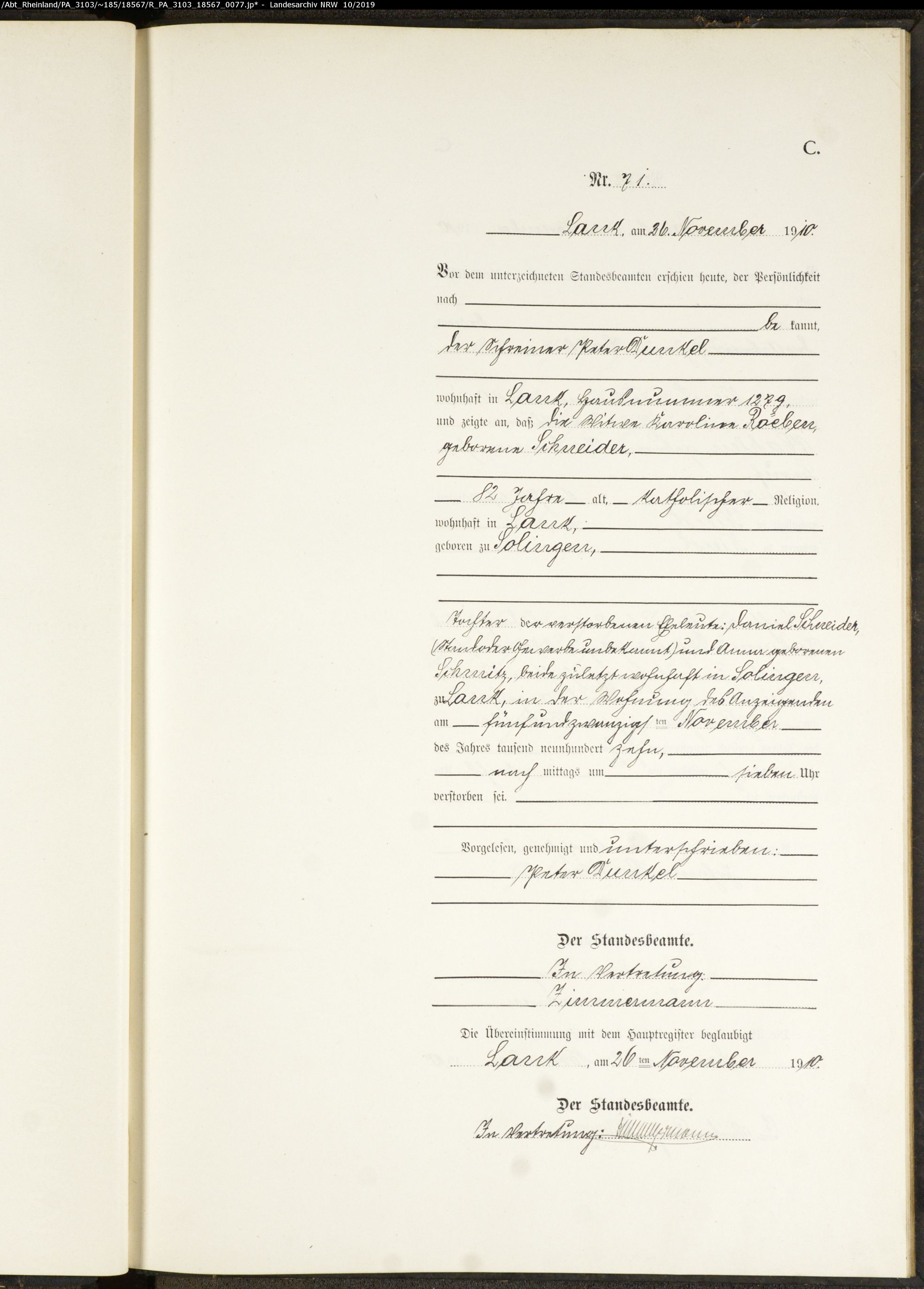 - Roeben, Karoline, ohne Beruf, Witwe, geb. zu Solingen, ca. 1828, verst. 25. November 1910 zu Lank (heute Meerbusch) in der Wohnung des Anzeigenden, Alter 82 Jahre, wohnhaft in Lank, katholischer Religion, verstorbene Eltern Daniel Schneider und Anna geborene Schmitz, beide zuletzt Wohnhaft in Solingen, Anzeigender Schreiner Peter Dunkel, wohnhaft in Lank Hausnummer 127g Sterberegister 71/1910 Standesamt Lank