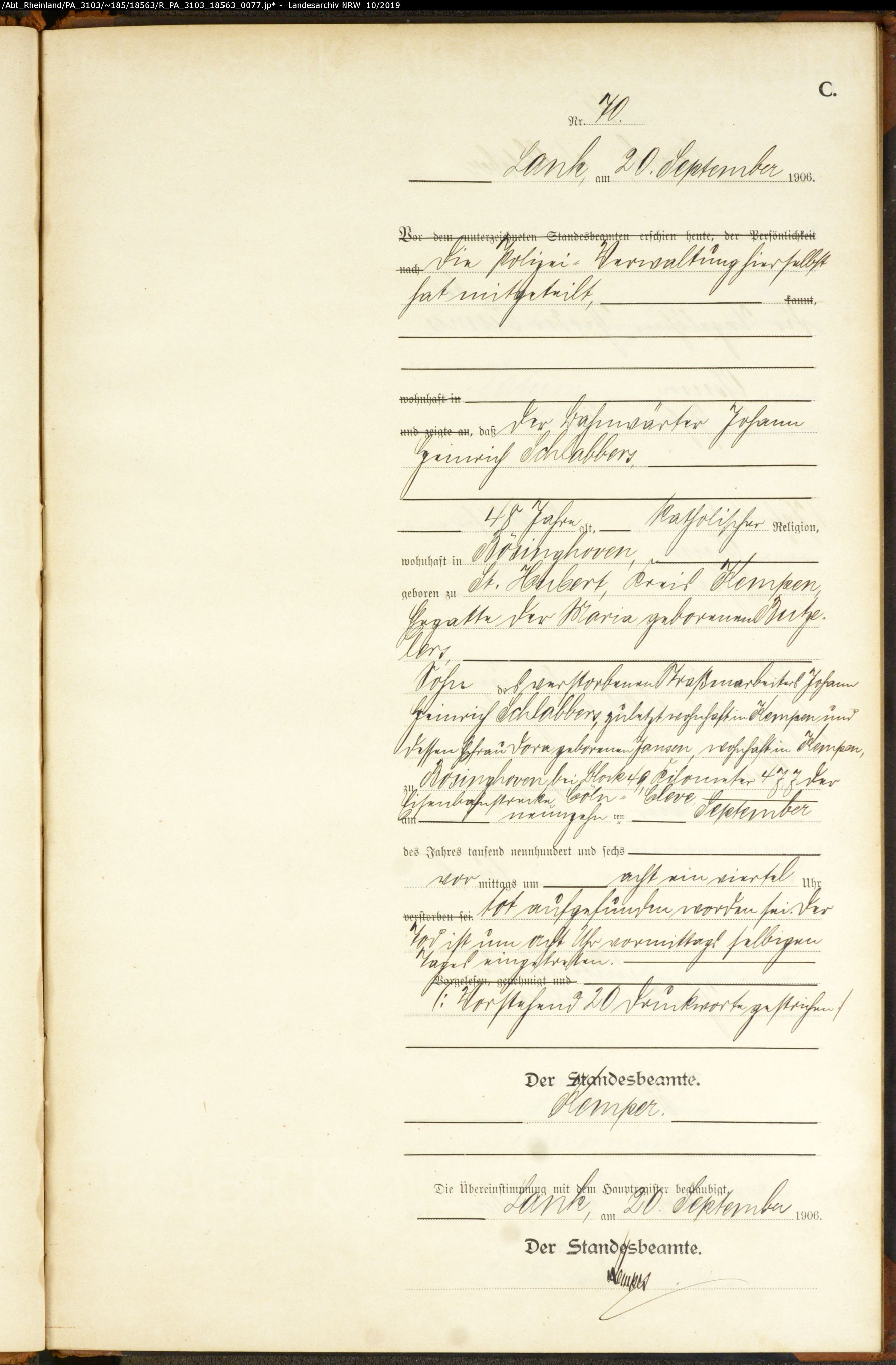 - Schlabbers, Johann Heinrich, geb. in St. Hubert Kreis Kempen, ca. 1858, verst. 19. September 1906 zu Bösinghoven (heute Meerbusch) bei Block 49 Kilometer 477 der Eisenbahnstrecke Cöln - Cleve, Alter 48 Jahre, Ehegatte der Maria Butzelers, Eltern Straßenarbeiter Johann Heinrich Schlabbers, zuletzt wohnhaft in Kempen, und Dora geb. Jansen, wohnhaft in Kempen, Angezeigt durch die Polizei-Verwaltung Sterberegister 70/1906 Standesamt Lank