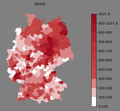 Relative Verteilung des Namens Ulrich (1996)Direkt zur Karte Die Farbskala zeigt die Anzahl von "Ulrich" bezogen auf je 1 Million Einträge. |