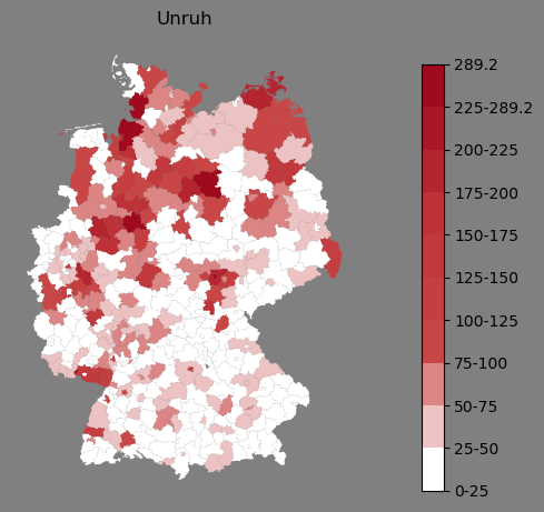 Relative Verteilung des Namens Unruh (1996)Direkt zur Karte Die Farbskala zeigt die Anzahl von "Unruh" bezogen auf je 1 Million Einträge. |