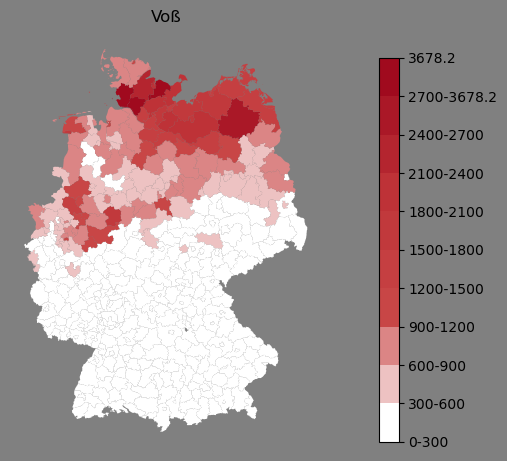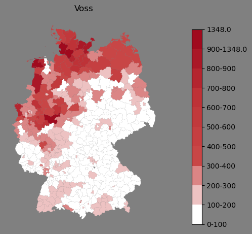 Absolute Verteilung des Namens Voß (1890)Direkt zur Karte Absolute Verteilung des Namens "Voß" um 1890 im damaligen Deutschen Reich Sie können die Karte innerhalb des Fensters zoomen und verschieben. |