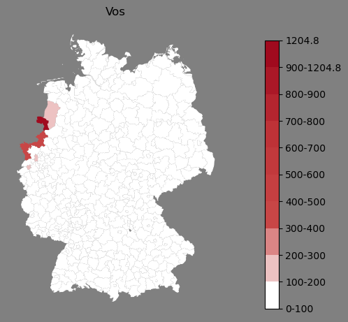 Die Varianten des Namens "Voß" und "Voss" kommen im ganzen norddeutschen Raum vor und sind, soweit das mit dem bloßem Auge zu beurteilen ist, nahezu deckungsgleich. Nur die relative Konzentration der beiden Varianten im Nordosten ist üblicherweise mehr "Voß" als "Voss". Die Variante "Vos" kommt dahingegen mehr zur Westgrenze vor, zu den Niederlanden. Damit ist diese eine deutlich mehr westorientierte Schreibweise dieses Namens. Ein Grund hierfür ist sicherlich , die Nähe zum niederländischen Raum wo noch immer vos (also Fuchs, vulpes vulpes) mit einem "s" geschrieben wird. Vermutlich ist diese Schreibweise in der Modernen Zeit in Deutschland weitgehend verdrängt worden zugunsten von den anderen beiden Varianten "Voß" und "Voss".