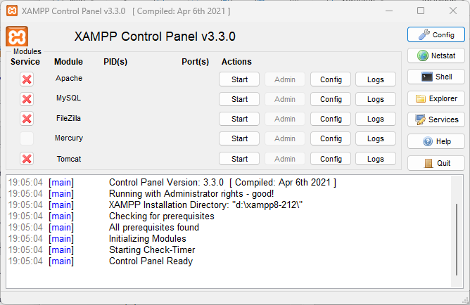 XAMPP ist der Klassiker unter den vorkonfigurierten Web-Stacks (gibt es seit 2003). Das Stammverzeichnis ist htdocs. Beim Start von XAMPP - xampp-control.exe - erscheint ein Programmfenster, in dem alle Teilprozesse verwaltet und Details geprüft und weitere Komponenten aufgerufen werden können. XAMPP erfordert nicht zwingend Administrator-Rechte, die Einrichtung als System-Service ist optional.