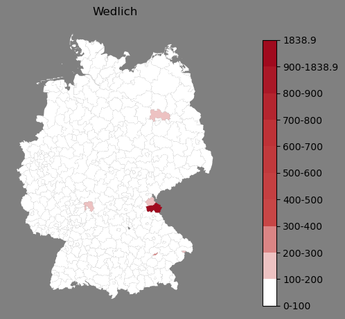Relative Verteilung des Namens Wedlich (1996)Direkt zur Karte Die Farbskala zeigt die Anzahl von "Wedlich" bezogen auf je 1 Million Einträge. |